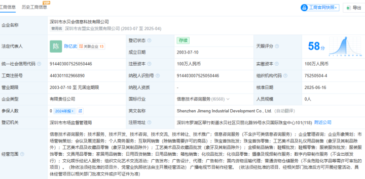 “水贝会”服务号的认证主体为深圳市水贝会信息科技有限公司。据天眼查,公司曾用名为深圳市吉盟实业发展有限公司,成立于2003年,吉盟珠宝成员,是一家以从事软件和信息技术服务业为主的企业。企业注册资本100万人民币,实缴资本100万人民币。